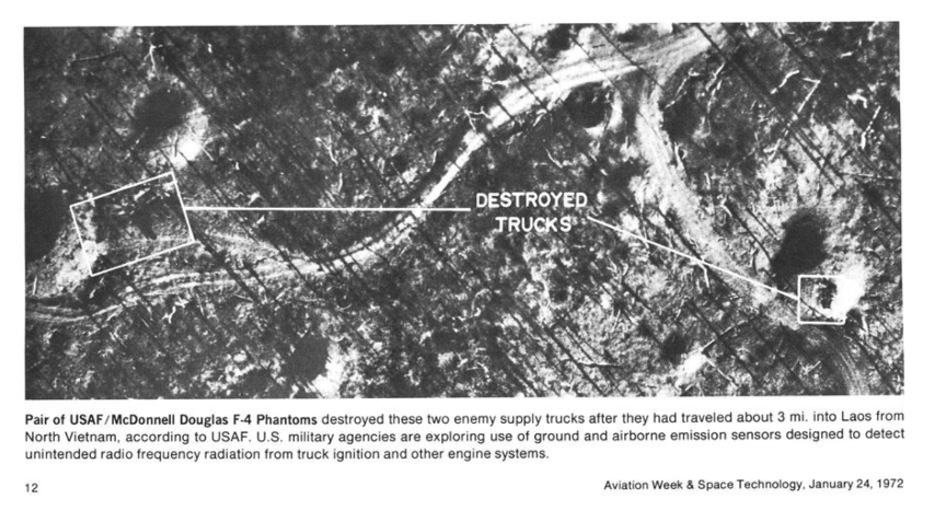 He wrote: "But indications are that sensitive airborne emission sensors designed to detect unintended RF radiation from truck ignition and other engine systems were highly successful in Vietnam."
