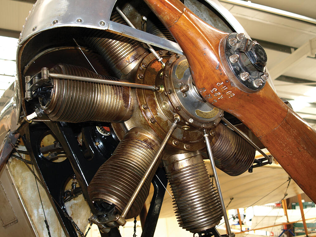 Early engine makers developed a method of providing adequate cooling air by designing a configuration in which the crankshaft was fixed to the airframe while the entire crankcase and cylinders rotated. The concept was pioneered by French automotive engineers Louis and Laurent Seguin, who founded the “Société des Moteurs Gnome” in Gennevilliers, near Paris, in 1905. Following a merger with the “Société des Moteurs Le Rhône” in 1912, the “Gnome et Rhône” rotary engines, like the one pictured, became ubiquitous during World War I, powering both Allied and German aircraft.