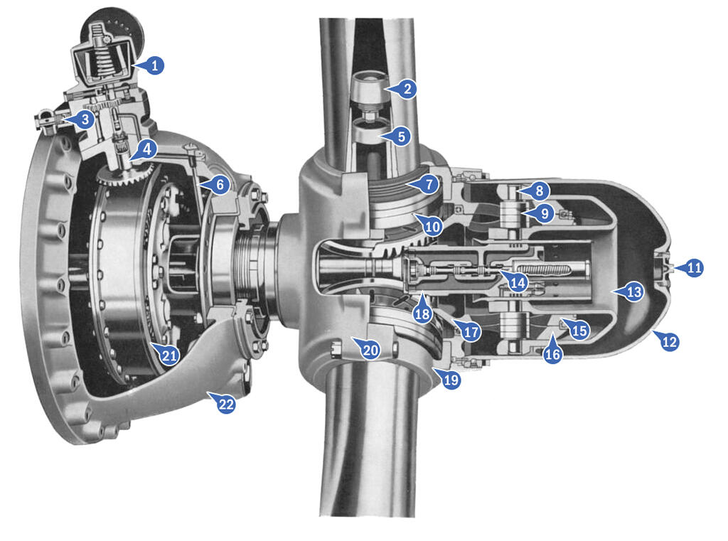 1) Governor 2) Blade Plug 3) Auxiliary Oil Connection 4) Governor Drive 5) Spider Arm 6) Governor Oil Line 7) Blade-to-Barrel Oil Seal 8) Cam Shaft 9) Cam Rollers 10) Thrust Bearing Assembly 11) Dome Plug 12) Dome Shell 13) Piston 14) Distributor Valve 15) Cam Bearing 16) Stationary Cam 17) Rotating Cam 18) Blade Gear Segment 19) Front Barrel Half 20) Rear Barrel Half 21) Propeller Reduction Gear 22) Engine Nose Section.
