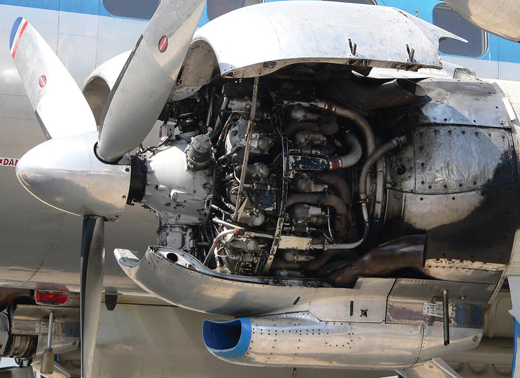 Piston power ultimately culminated in engines such as Pratt & Whitney’s 2,800-hp R-2800 Double Wasp and 3,500-hp R-4360 Wasp Major. Curtiss-Wright developed an 18-cylinder 2,200-hp R-3350 Duplex Cyclone and the 3,700-hp Turbo-Compound variant with three GE turbochargers. Powering the last and most advanced production piston airliners—the Douglas DC-7C and Lockheed Super Constellation—the Wright Turbo-Compound represented a 280-fold increase in power over the first Wright four-cylinder engine.
