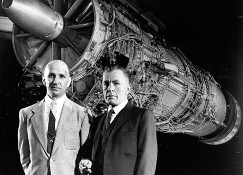 Early jet engines were prone to compressor stall and other operating problems at low speeds, particularly during acceleration. A novel solution, devised by GE engineer Gerhard Neumann (left, with J79 co-designer Neil Burgess) for the J79 turbojet in 1954, was an automatic system that altered the angle of moveable inlet guide vanes and compressor stators as engine speed rose. The breakthrough made flights possible at Mach 2 and above and laid the foundation for modern high-bypass turbofans.