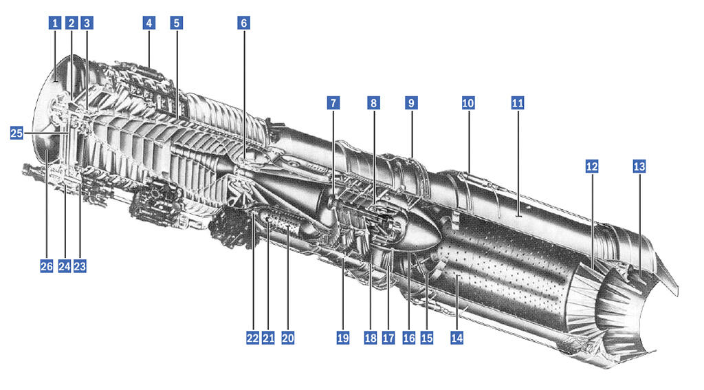 1) Air Intake 2) Front Gear Case 3) No. 1 Bearing Housing 4) Variable Vane Actuator 5) 17-Stage Compressor Section 6) No. 2 Bearing House 7) Three-Stage Turbine Wheel 8) No. 3 Bearing Housing 9) Afterburner Fuel Manifolds 10) Exhaust Nozzle Flaps Actuator 11) Tailpipe 12) Primary Exhaust Nozzle Flaps 13) Secondary Exhaust Nozzle Flaps 14. Tailpipe Liner 15) Flame Holder 16) Exhaust Cone 17) Afterburner Spray Bar 18) Tailpipe Temperature Thermocouple 19. 3-Stage Turbine Section 20) Combustion Chamber 21. Cross-Fire Duct 22) Fuel Nozzle 23) Horizontal Accessory Driveshaft 24) Transfer Gear Case 25) Vertical Accessory Driveshaft 26) Variable Inlet Guide Vanes.