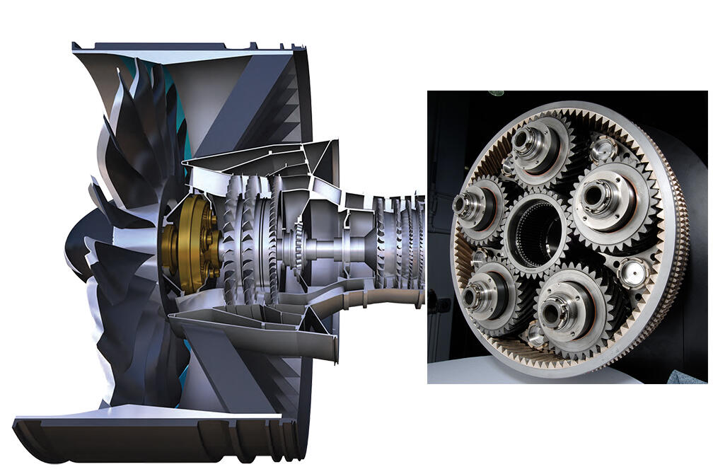 Pratt & Whitney has developed a family of geared turbofans that link the low-pressure turbine and fan via a gear system. The concept, which was previously successfully tried on lower-thrust engines such as the Honeywell TFE731 and LF502 families, enables the engine to be more efficient by allowing the fan to run more slowly and the low-pressure compressor and turbine to run faster. Pratt’s PW1000G geared fan (above) currently includes three main members and five applications, but is expected to grow in both numbers and thrust range. Rolls-Royce also plans to adopt the concept for its future UltraFan high-thrust engine.