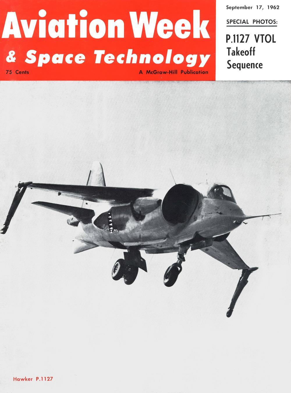 The Hawker P1127 strike fighter demonstrated a vertical takeoff captured in the photo essay about the Farnborough Airshow flying display.
