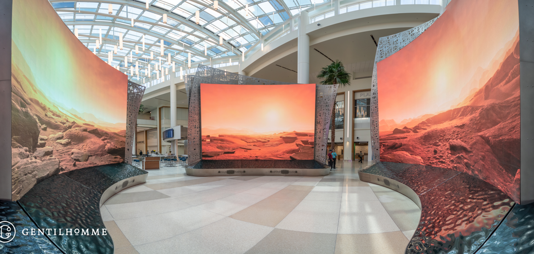 Each installation has its own experiential identity reflecting the surrounding landscape and hosts hours of custom-created content that celebrates the beauty and transformative development of Central Florida, one of the world’s richest ecosystems. This is a first of its kind for a digital public art installation in the aviation space. Hours of live action, original sound composition, CGI and interactive custom content will tower within 114-feet wide displays across 3,888 sq ft of custom LED panels.