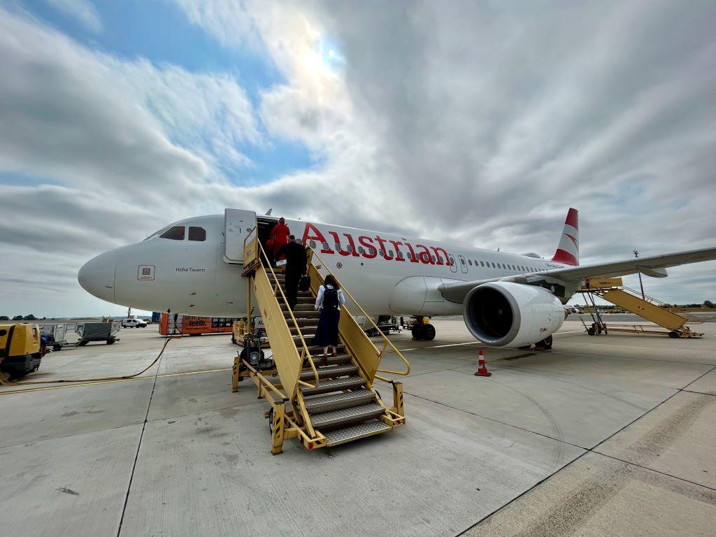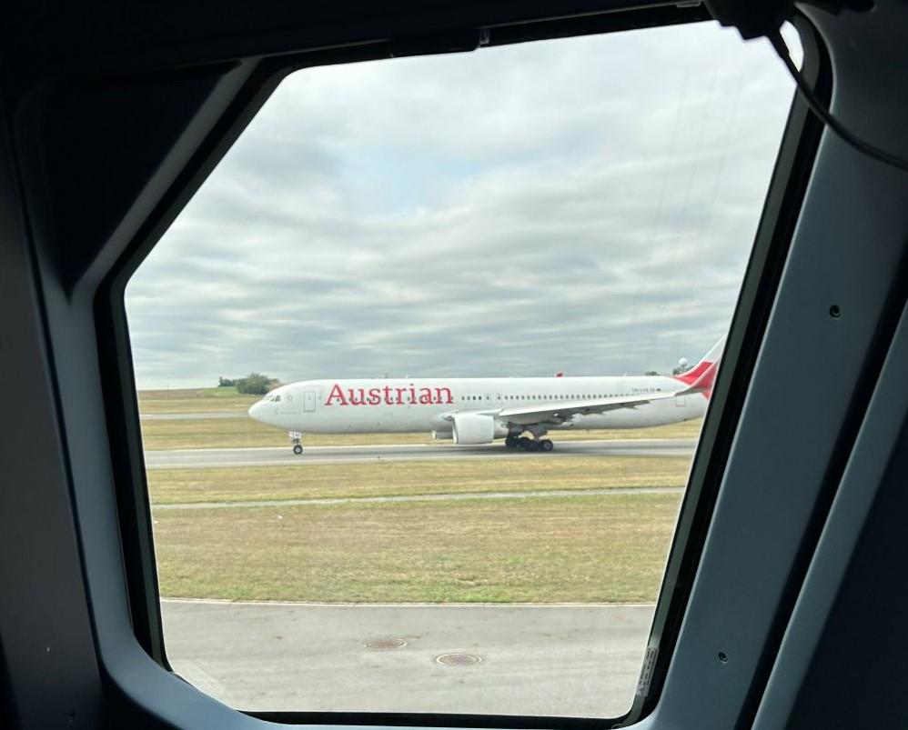 After 1 hr. and 10 min., the Austrian Airlines’ A320, registration #OE-LBN, landed ahead of schedule in Vienna, this time piloted by Radl. An Austrian Boeing 767 is seen from a window.