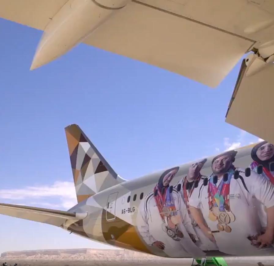 Etihad Airways, the official airline partner of Special Olympics World Games Abu Dhabi 2019, featured a special livery to promote the games, which took place in the nation’s capital in March 2019. The livery, on an Etihad Boeing 787-9, features four Special Olympics athletes: swimmer Omar Al Shami, runner Hamda Alhosani, and bowlers Saleh Almarri and Mariam Al Hosani.