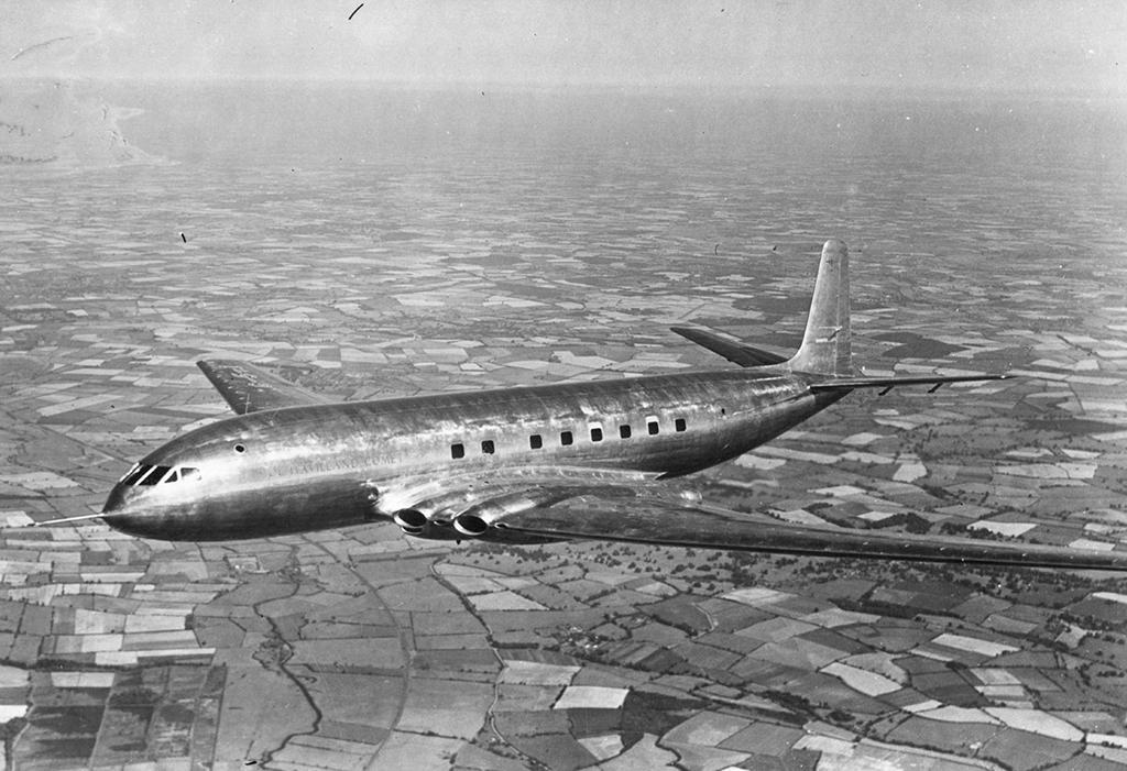 1949. First flight of de Havilland Comet, first production jet airliner, enters service in 1952.