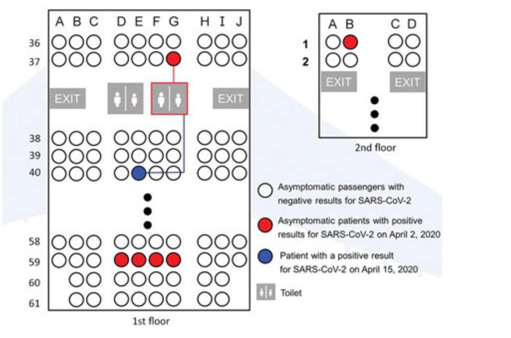 Six of the passengers tested positive for the virus on Day 1 and were immediately transferred to a hospital. On Day 14, a 28-year-old woman tested positive. She reported wearing an N95 mask during the flight except when she used the toilet, which was shared by the passengers sitting near her. One of those passengers was an asymptomatic infected person seated three rows forward of the woman (the lavatory itself separated the two passengers, as well).