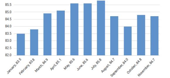 U.S. Airlines Systemwide Seasonally-Adjusted Load Factor (RPMs/ASMs) 2016 - 2019
