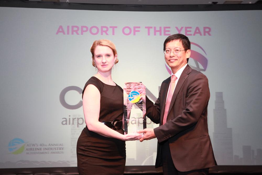 Singapore Changi Airport vice president Tan Lye Teck receives ATW's Airport of the Year award from ATW European bureau chief Victoria Moores.