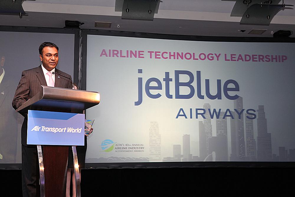 JetBlue Airways chief information officer Eash Sundaram accepts ATW's Airline Technology Leadership award.