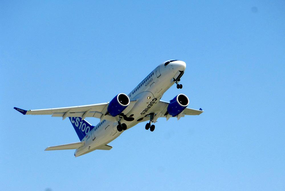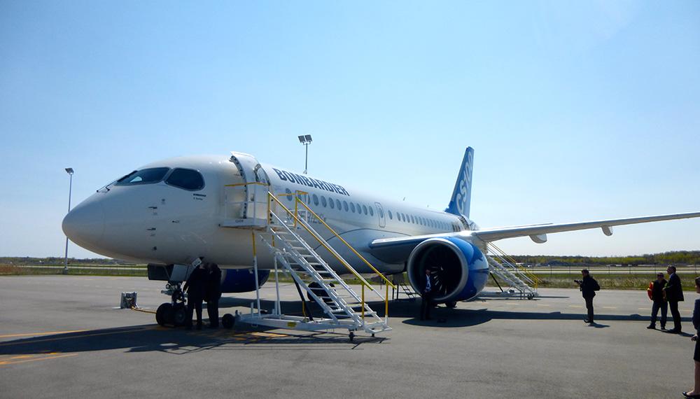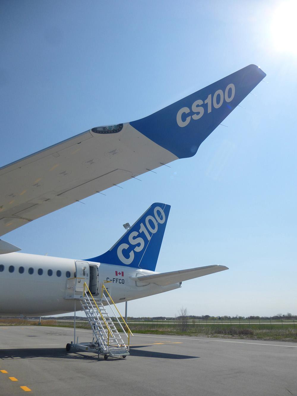The CS100 route-proving aircraft, which flew through North America and Europe, on the tarmac at Montreal-Mirabel International Airport.