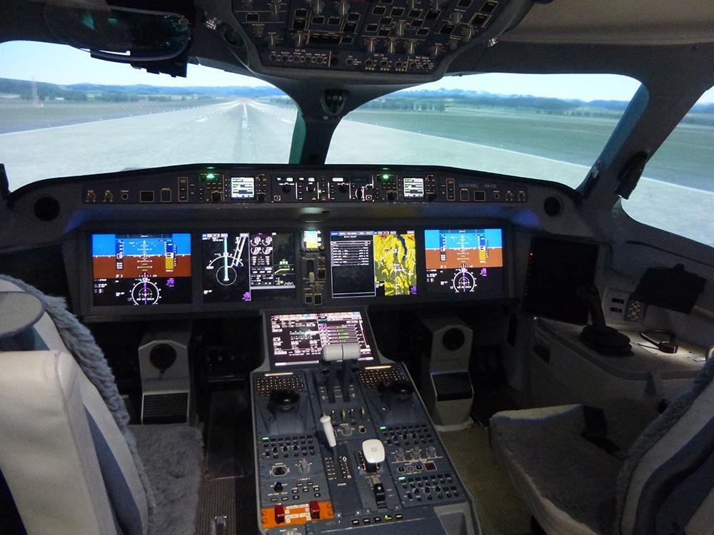 SWISS CSeries program manager and fleet chief Peter Koch in the spacious cockpit. SWISS will have 34 pilots ready to fly the CSeries when scheduled operations begin in July.