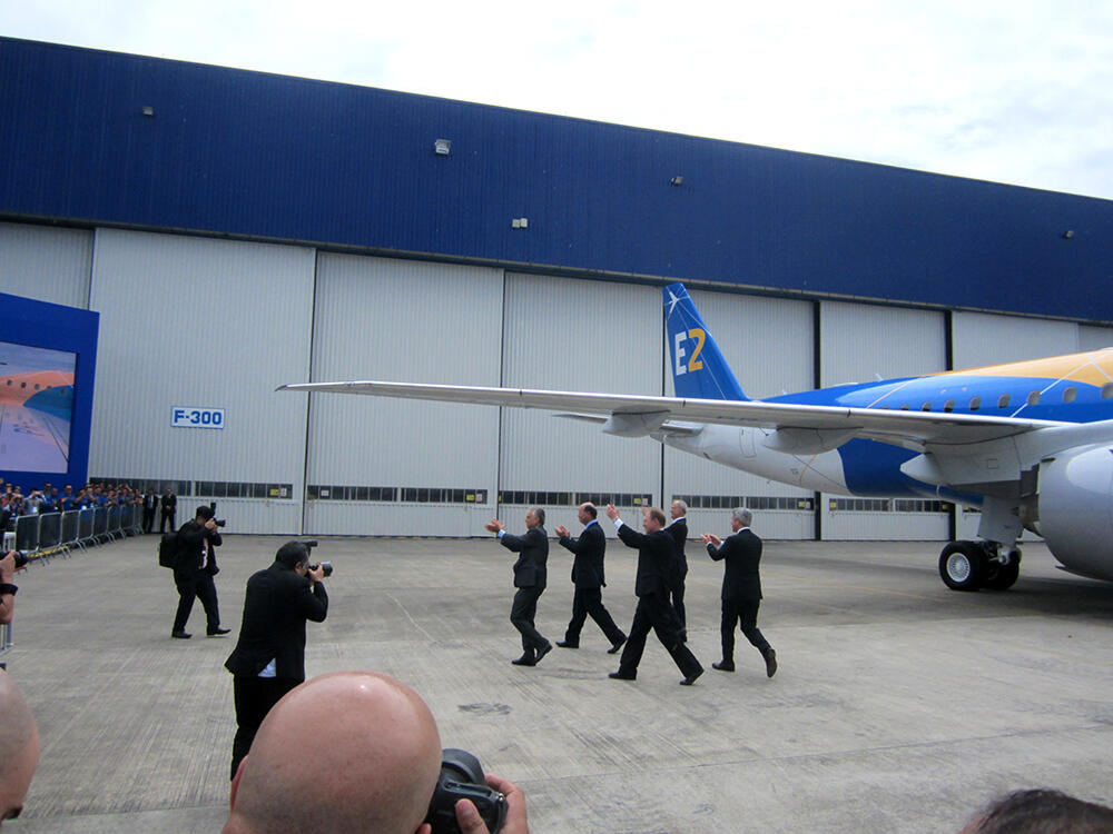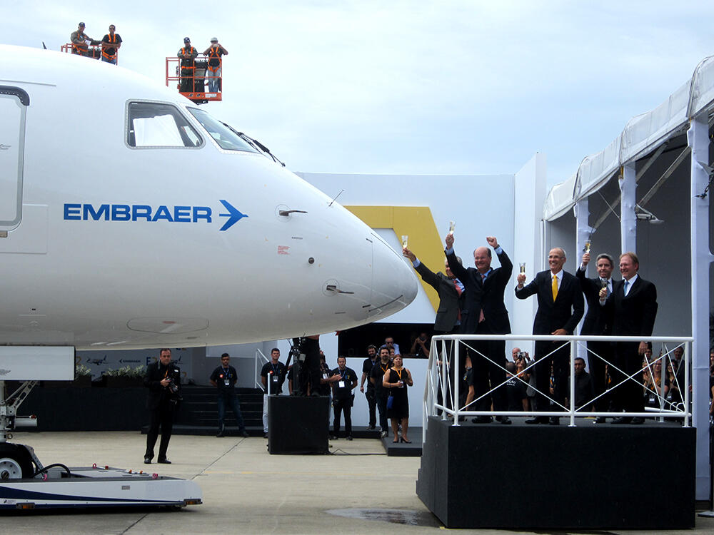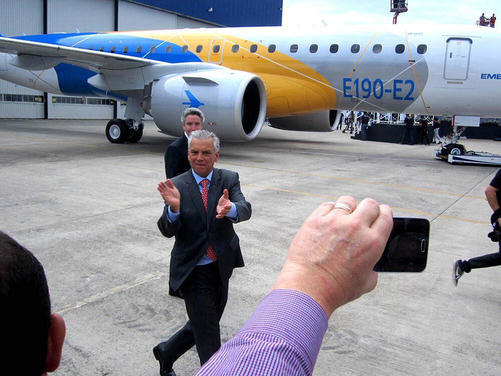 Embraer Commercial Aviation president and CEO Paulo Cesar Silva and Embraer Commercial Aircraft CCO John Slattery applaud press.