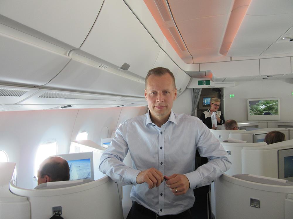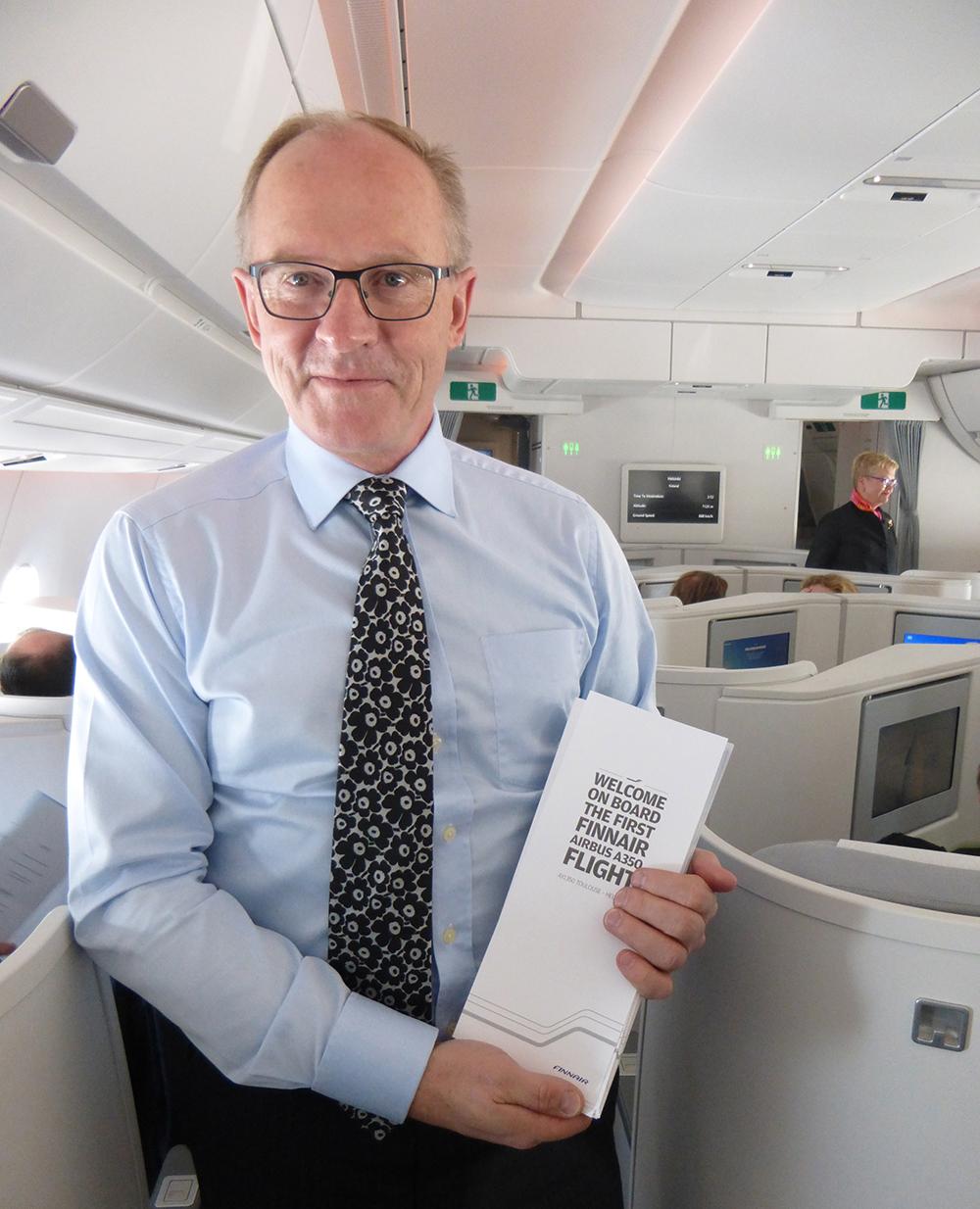 CEO Pekka Vauramo gives a dedicated menu card to the passengers.