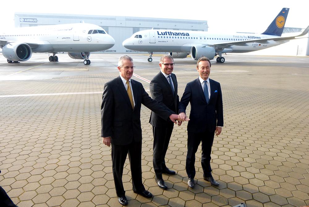 Pratt & Whitney president Robert Leduc, Lufthansa chairman & CEO Carsten Spohr and Airbus CEO Fabrice Brégier