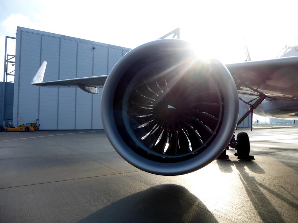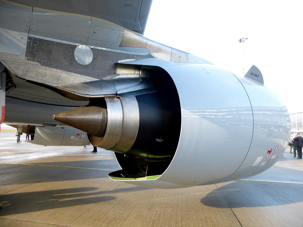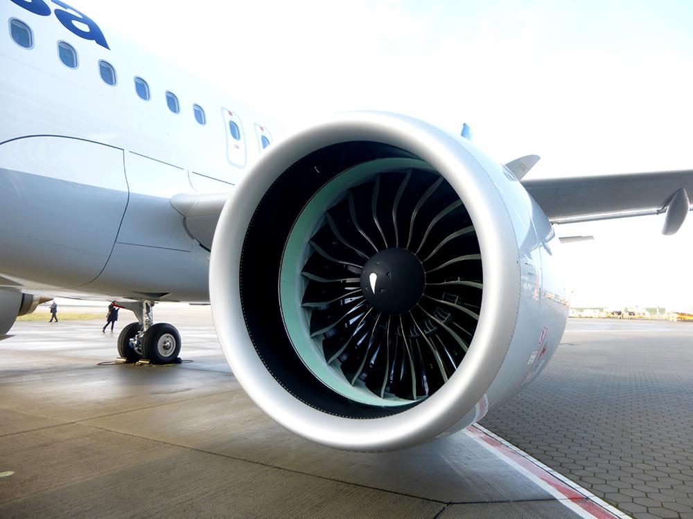 An A320neo PW1100G-JM engine from Pratt & Whitney. Pilots told ATW the engines bring the A320neo to a flight level of 32,000 feet in about 16 minutes. The A320 Classic needs about 23 minutes.
