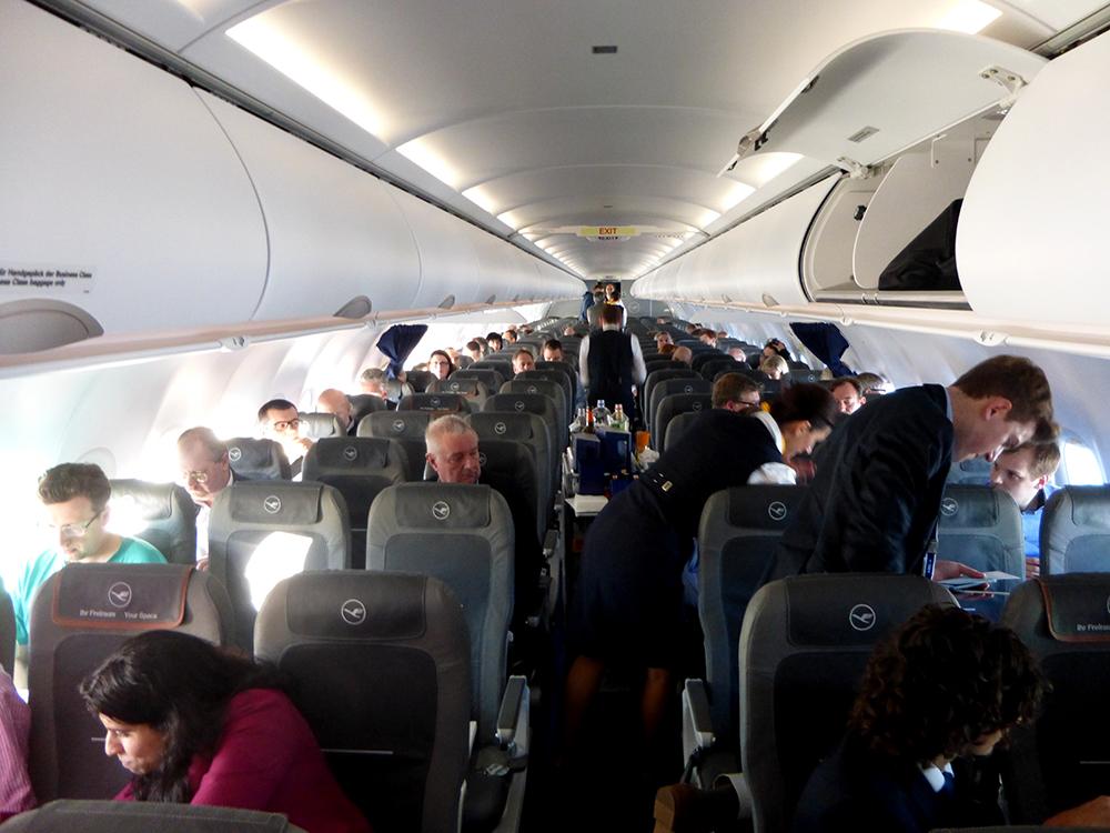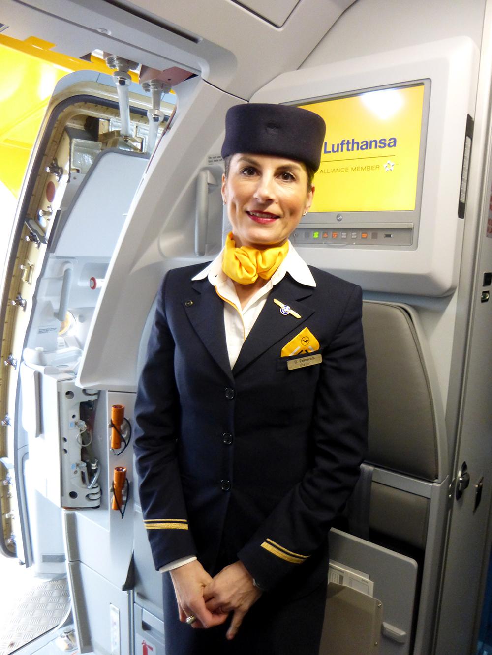 A friendly Lufthansa flight attendant welcomes the passengers on this special flight to Frankfurt.