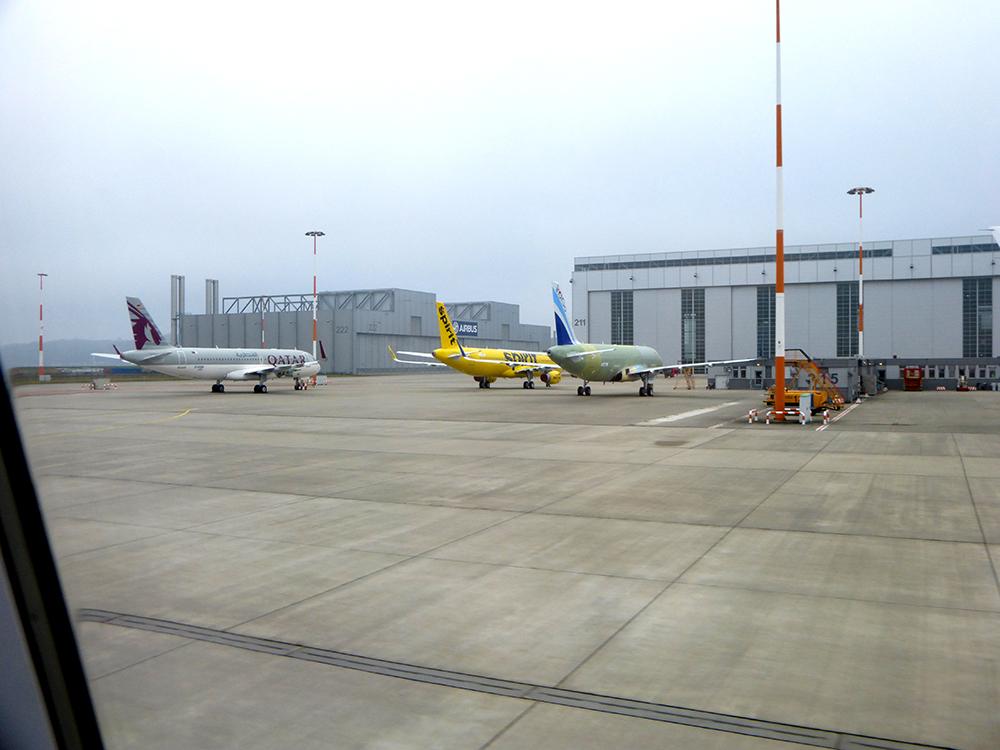On the flight line in Hamburg, Qatar Airways, IndiGo and Spirit A320 family aircraft await completion.
