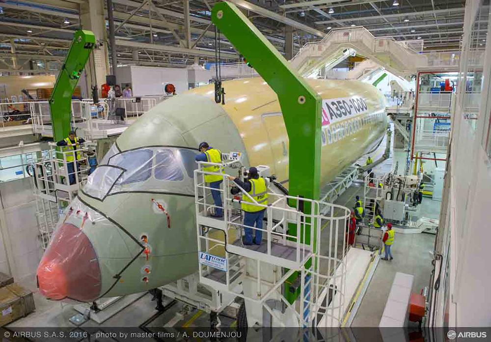 Airbus has started final assembly of the first A350-1000 on schedule at the A350 XWB Final Assembly Line (FAL) in Toulouse. This A350-1000, one of three flight test aircraft to be built, will operate its maiden flight before the end of 2016.