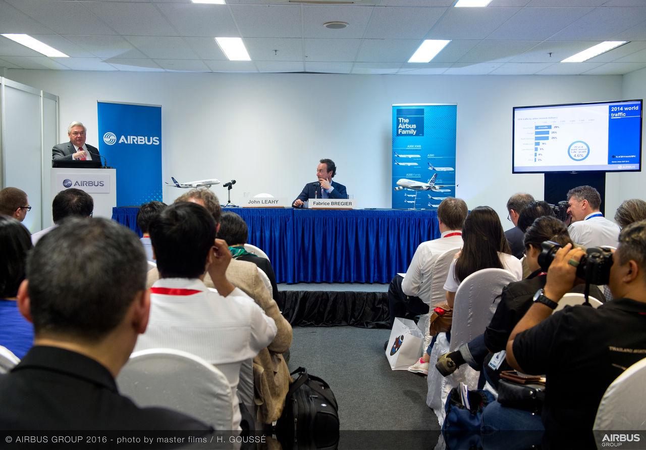 Airbus COO John Leahy and Airbus president and CEO Fabrice Brégier at a press conference at the Singapore Airshow