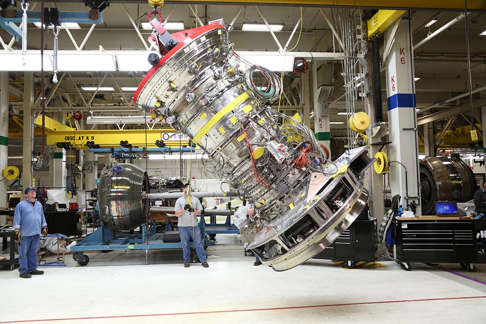 The first full GE9X engine is rotated into the horizontal assembly position at GE Aviation’s Evendale, Ohio development assembly area.