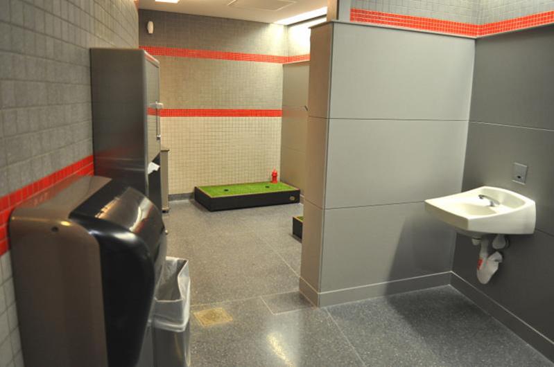 Indoor service animal/pet relief room at Chicago O'Hare International Airport. Located past security checkpoints in the Rotunda area of Terminal 3, the room is specially designed to accommodate passengers traveling with service animals or pets. The room has two, 2-foot by 4-foot pet relief areas complete with artificial grass covering, miniature fire hydrants and pop-up sprinkler systems to wash away liquid waste into a drain. In addition, a mounted hose bib and reel is available for manual spraying and plastic bags are provided for clean-up. The room is enclosed, has a door with a glass pane that opens and closes automatically, and is designed for wheelchair access. The room also includes two sinks for passenger use.