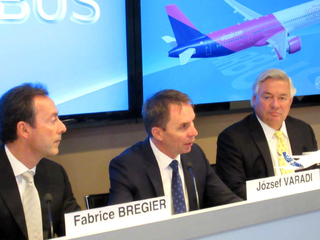 Airbus president and CEO Fabrice Bregier, Wizz Air CEO Jozsef Varadi and Airbus COO-customers John Leahy at a press briefing announcing Wizz Air's order for 110 A321s.
