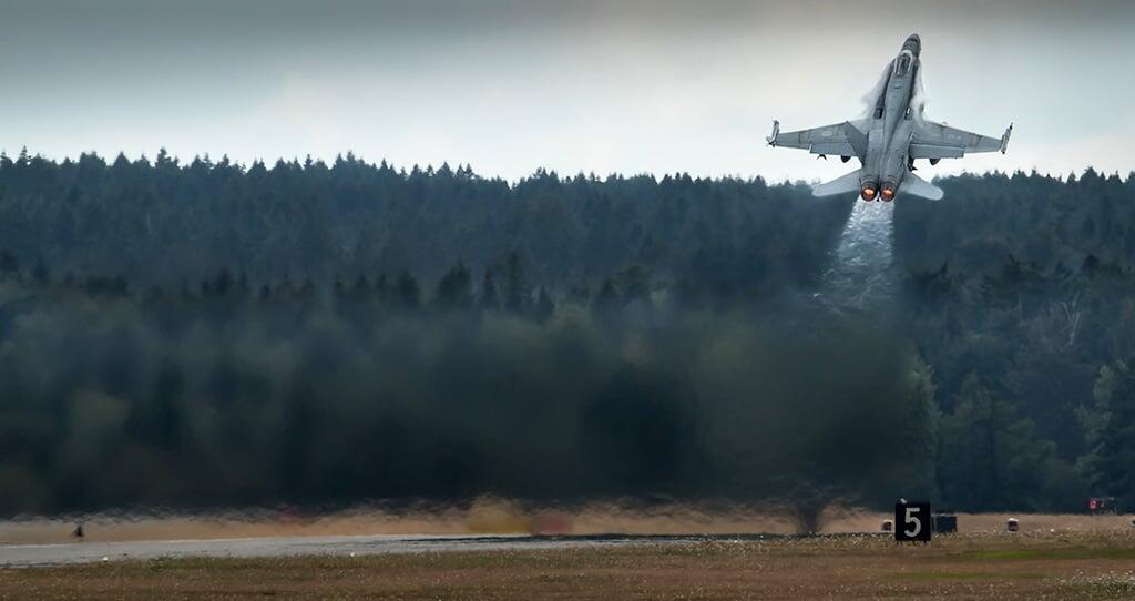 Flying the backup jet, 2016 CF-18 Demonstration pilot Capt. Ryan 'Roid' Kean pushes his CF-18 to the edge of the speed of sound during a very damp morning practice at 19 Wing CFB Comox, British Columbia.