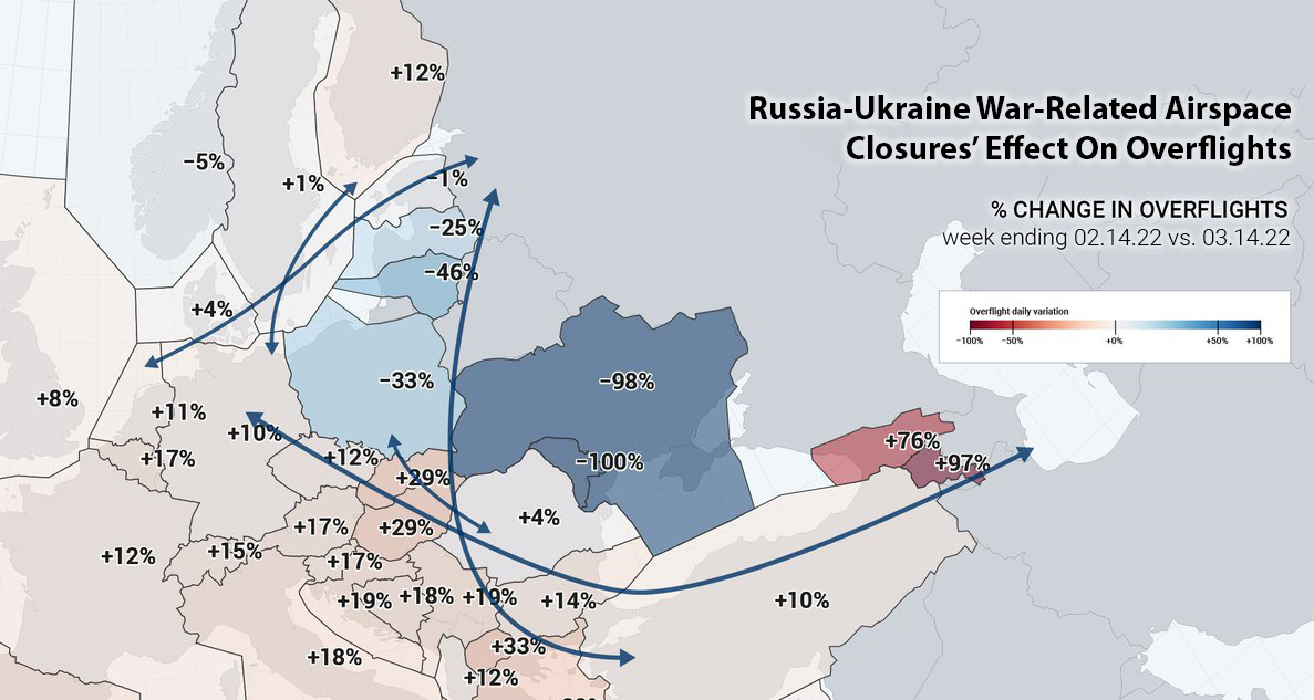 The graphic below illustrates the changes in overflights of European countries between mid-February, prior to the Russian invasion of Ukraine, and mid-March. Commercial flying to Ukraine has come to a standstill; overflights over neighboring Moldova have stopped. Commercial aircraft overflights over...
