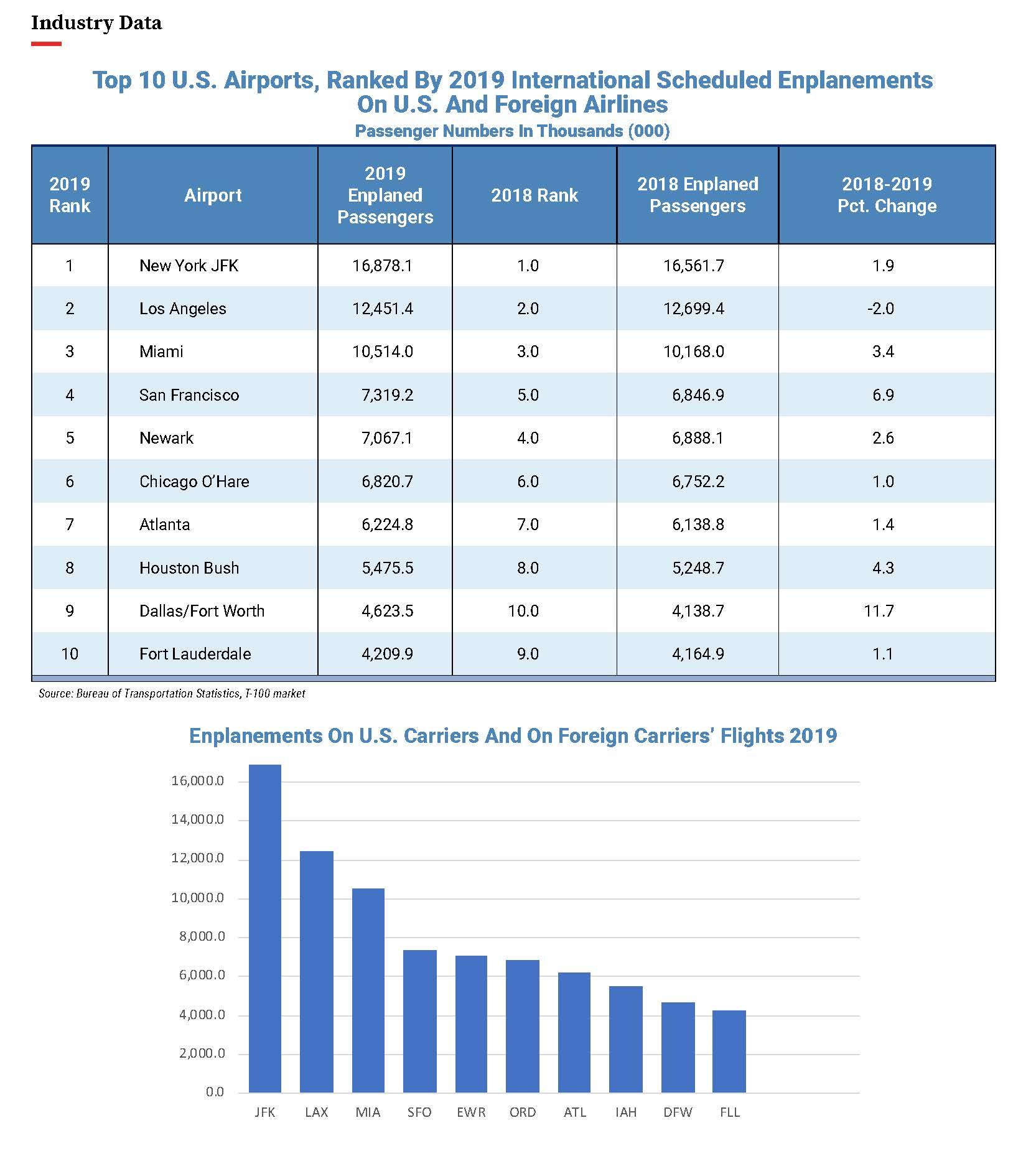 Top 10 U.S. Airports, Ranked By 2019 International Scheduled Enplanements On U.S. And Foreign Airlines