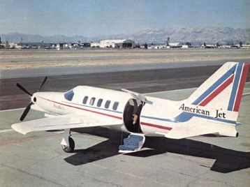 The aircraft is powered by an 850-eshp. Canadian Pratt & Whitney PT6A-41 turboprop and a standby 640-lb.-thrust Teledyne CAE J402-CA-400 turbojet.