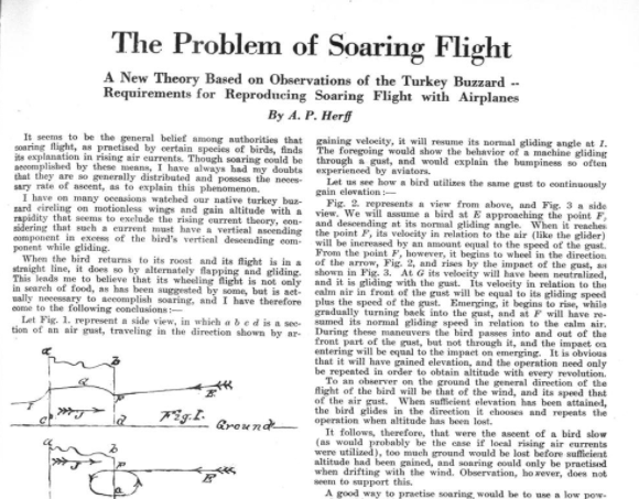 In this article, writer A. P. Herff considers a new theory based on observations of a turkey buzzard as requirements for reproducing soaring flight with airplanes.