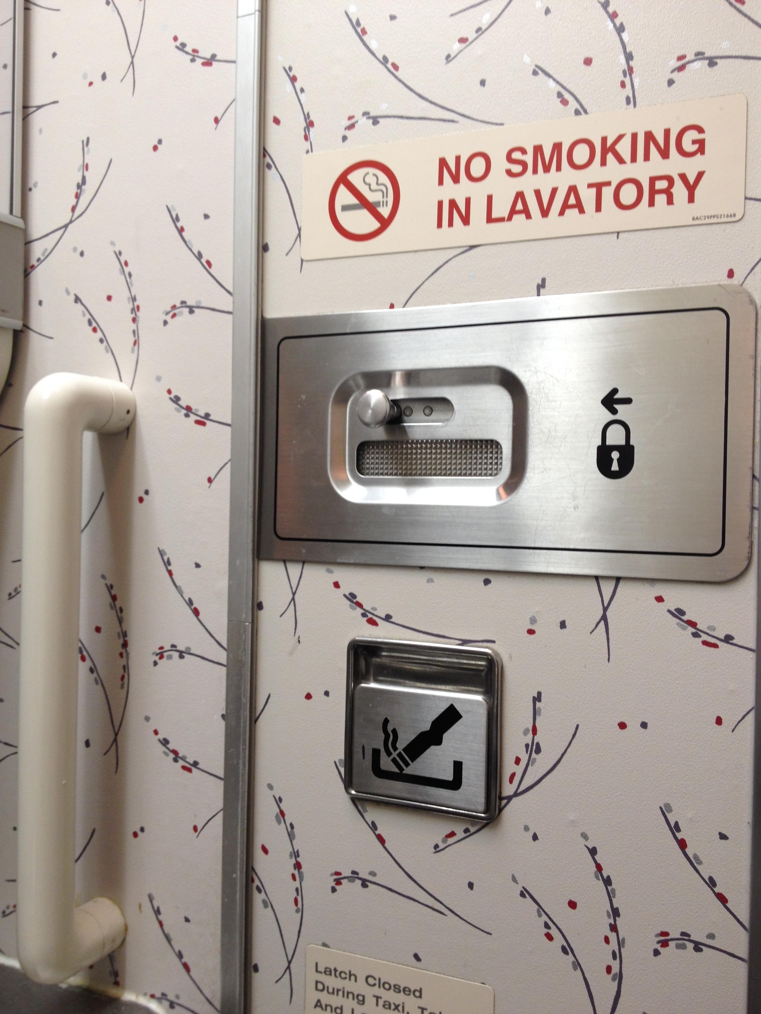 Although smoking on aircraft has been banned on all U.S. domestic flights since 2000, the FAA requires that ashtrays continue to be fitted to lavatory doors due to the fire risk of someone illegally smoking and disposing the smoking materials.