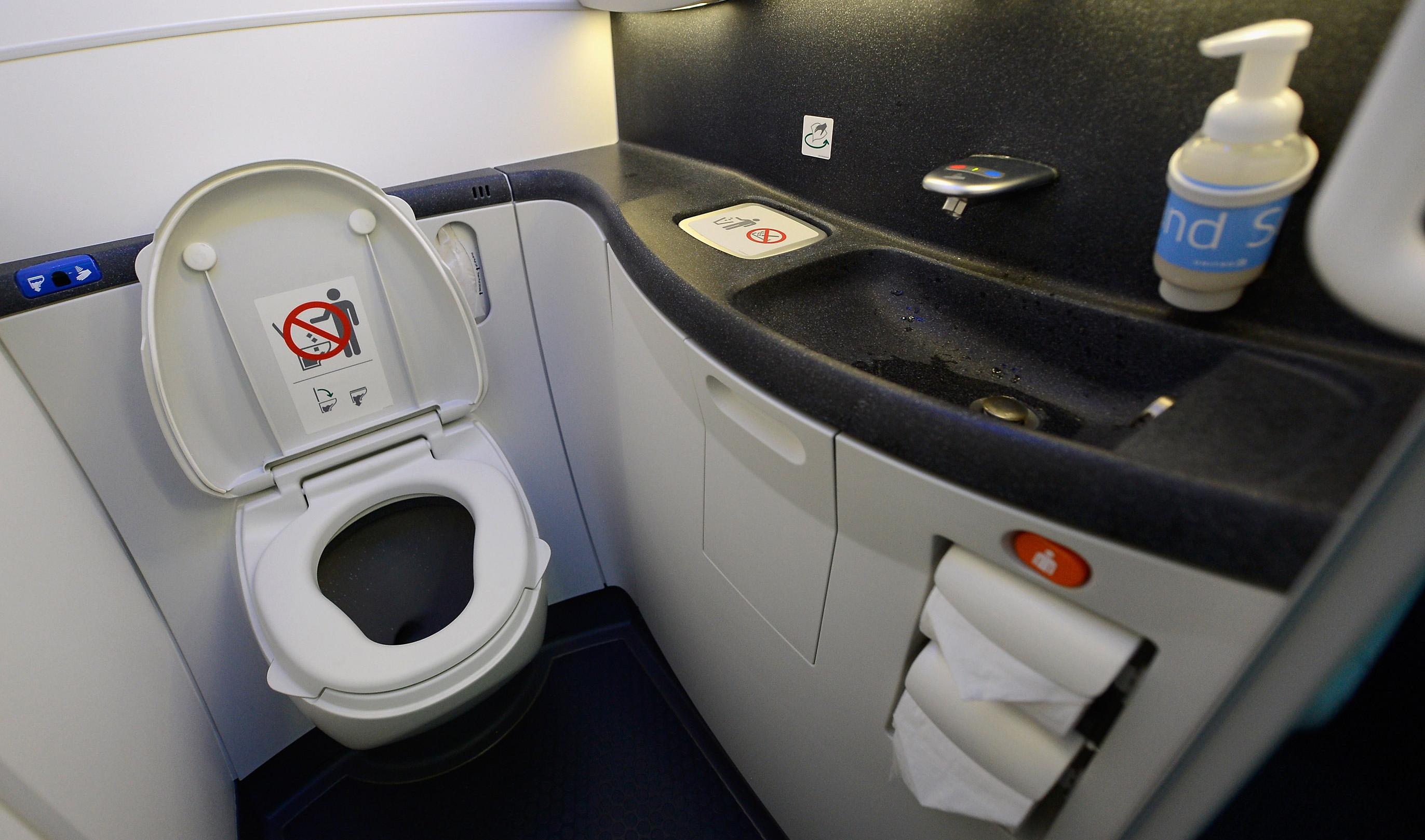 Patented in 1975, most aircraft lavatories are equipped with the 'vacuum flush' opposed to the 'chemical toilet blue water recirculate electric flush' to mitigate the risk of corrosive waste spill over and be less odor-inducing. (The 'vacuum flush' system is also substantially lighter.) Photo Credit: Getty Images