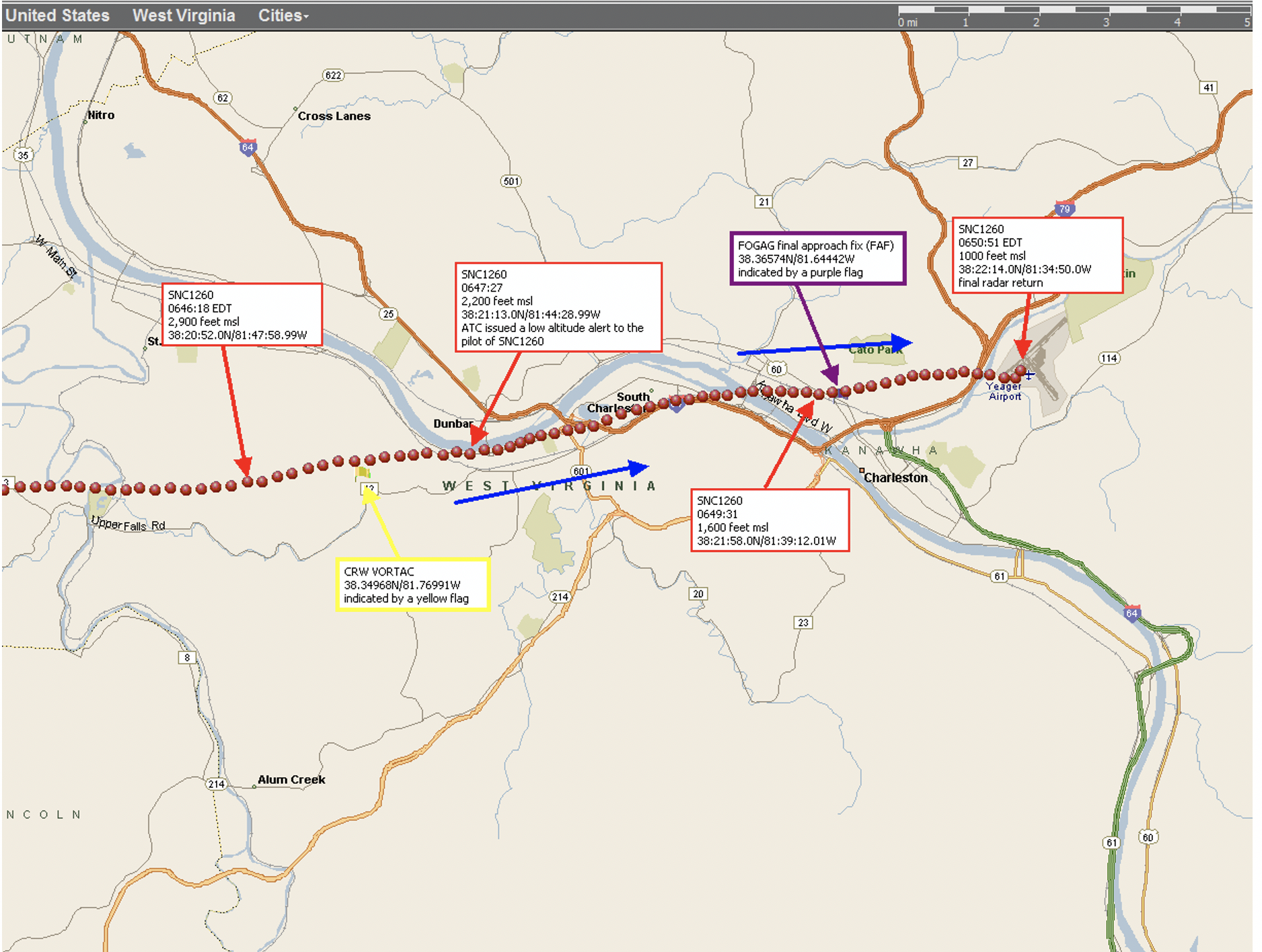 The FO checked in with the CRW terminal approach controller at 0637, level at 9,000 ft. and in receipt of ATIS “November.” The 0554 weather observation reported wind from 080 deg. at 11 knots, visibility 10 statute miles, scattered clouds at 700 ft. AGL, a broken ceiling at 1,300 ft. AGL and an overcast sky at 3,100 ft. AGL. The temperature was 14C, dew point 13C, altimeter 29.41 and the localizer approach to runway 5 was in use. However, 7 minutes before the crew checked in with the approach controller, a special weather observation had reported an overcast layer at 500 ft. and a remark of valley fog.