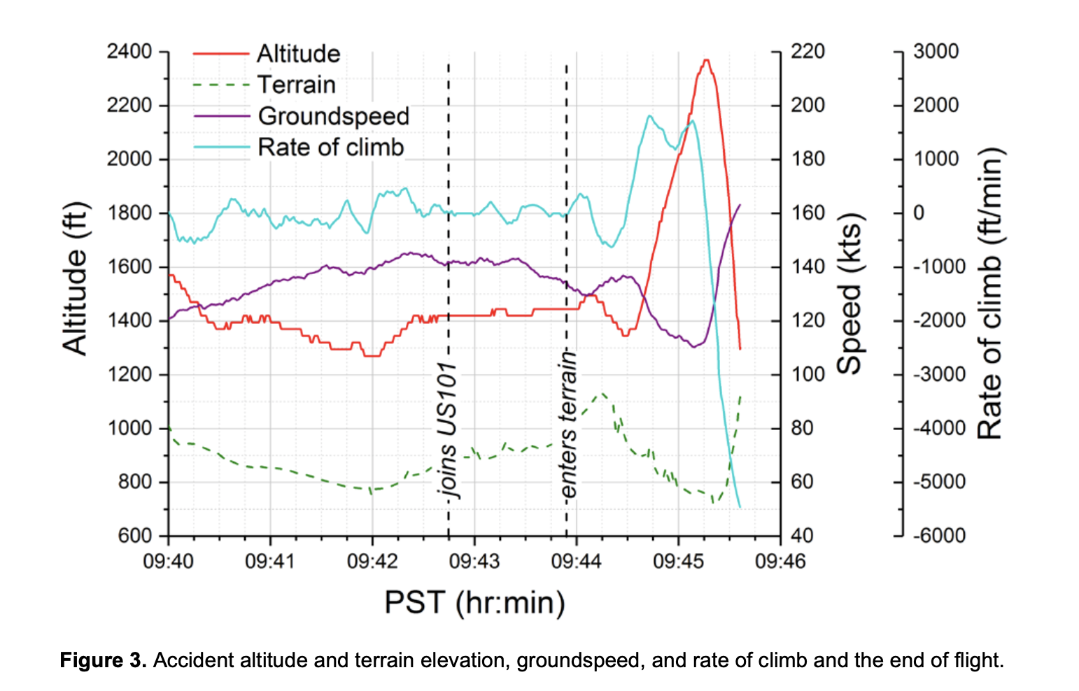 It is important for investigators to be able to establish a timeline of events during the accident flight and to establish the aircraft’s attitude, speed, configuration and trajectory in detail. The best sources for this information are crash-hardened recorders--a flight data recorder (FDR) and a cockpit voice recorder (CVR). Since neither was on board the accident helicopter (the CVR originally installed had been removed), the investigative team had to devise other ways to plot the track of the aircraft. A performance study was done using FAA ADS-B data, which recorded latitude and longitude, pressure and geometric altitude, and inertial speeds. A performance specialist was able to reconstruct the flight path using this data.