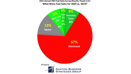 Nearly 70% of fixed base operators in the U.S. and Canada responding to a survey say fuel sales dropped in 2020 due to the COVID-19 pandemic, according to an annual FBO fuel sales survey.
