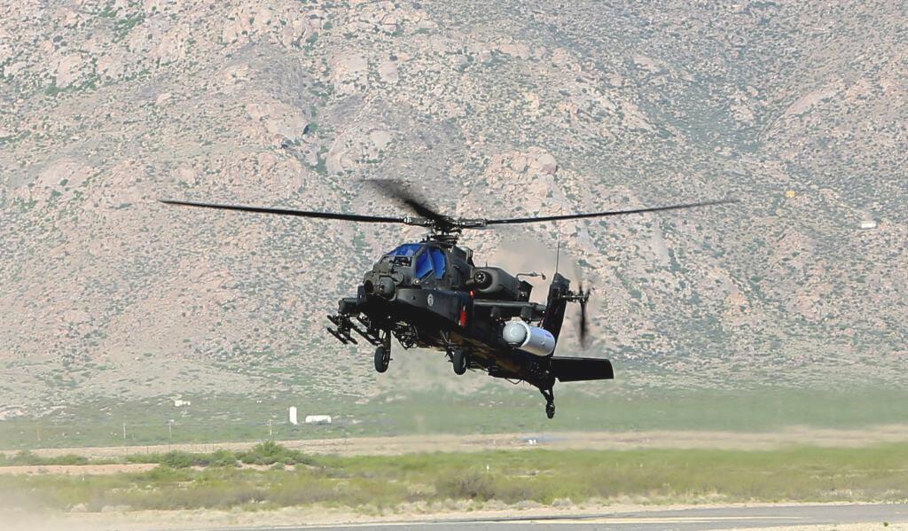 A Boeing AH-64 Apache attack helicopter armed with a pod-mounted Raytheon laser weapon shot an unmanned ground target in June tests at White Sands Missile Range in New Mexico, in partnership with the U.S. Special Operations Command and the U.S. Army Apache program office.