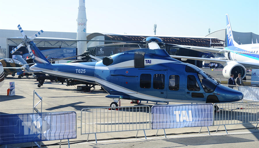 Turkish Aerospace Industries in June unveiled its T625 medium twin-turbine helicopter, with a first flight planned for 2018 and certification by the end of 2020. The 6-metric-ton (13,200-lb.) aircraft is powered by two 1,370-shp LHTEC CTS800 turboshafts driving a five-blade main and four-blade tail rotor.