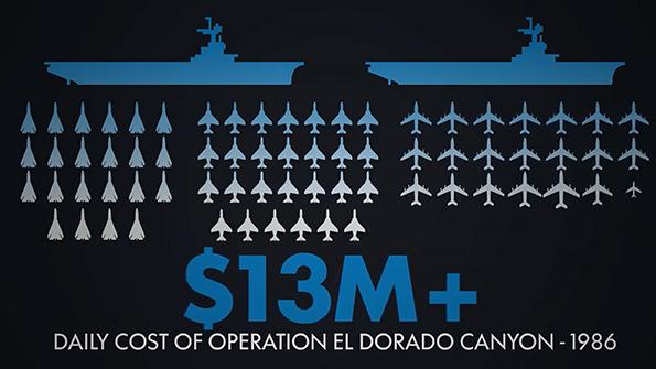 For the former example, Northrop presented the silhouettes of the strike package that included tankers, F-111s and A-6s. It appears Northrop mistakenly used silhouettes of F-4s instead of A-6s. But that’s not the worst mistake in the video: The company also showed the silhouettes of two aircraft carriers, which launched and recovered the 18 A-6s during the operation.