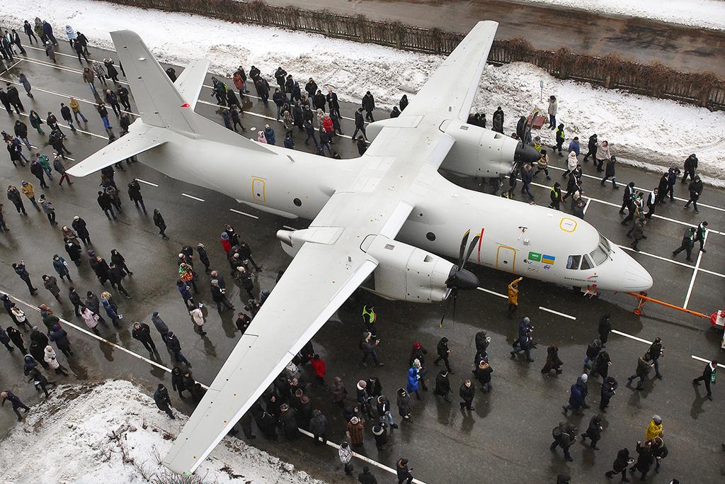 Antonov rolled out the An-132D light transport aircraft demonstrator on Dec. 20 in Kiev. A modernized An-32 with Pratt & Whitney Canada PW150A turboprops, Dowty propellers and Honeywell avionics, the An-132 will be produced in Saudi Arabia by Taqnia Aeronautics.