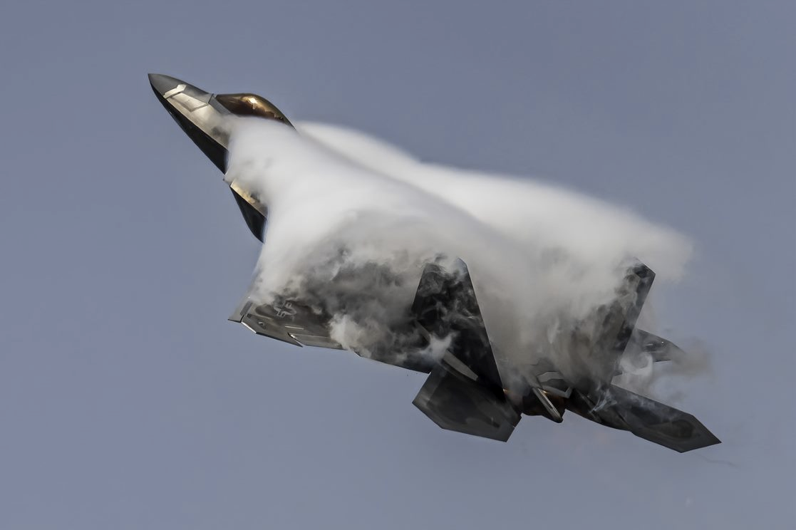 An F-22 Raptor bursts through vapor at the Space Coast Air Show in Titusville, Florida.