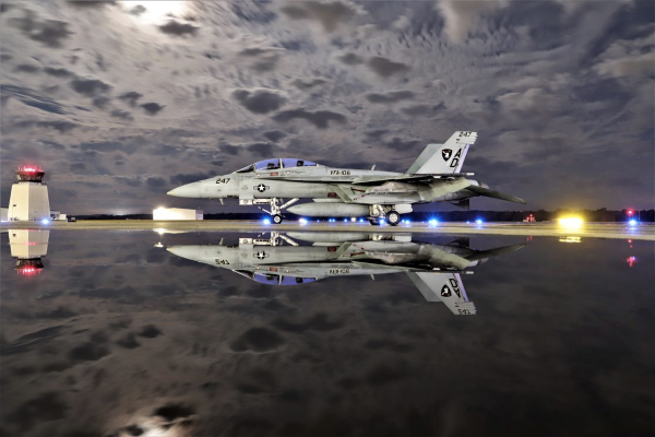 U.S. Navy Replacement Sqdn. VFA-106 Super Bug basks in the moonlight during an unscheduled extended stay at Key Field in Meridian Miss.