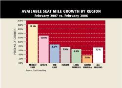 The Middle East may be just ahead of Africa as the second-smallest region in the world in terms of available seat miles, but that's set to change by 2010 when that corner of the globe surpasses Latin America and garners a 7% share, up from its current 4.5%. Much of that rise rests on capacity growth...