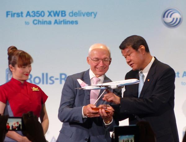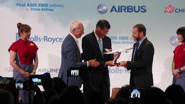 From left: Airbus executive VP-programs Didier Evrard, China Airlines chairman Nuan-Hsuan Ho and Rolls-Royce Civil Aerospace SVP-sales Phil Harris.