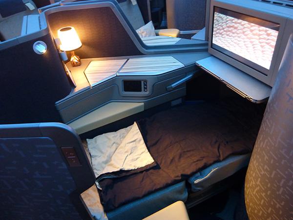 A premium-business class seat prepared as a full flat bed.