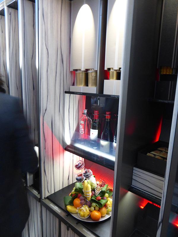 An onboard lounge offers refreshments and snacks during the flight.