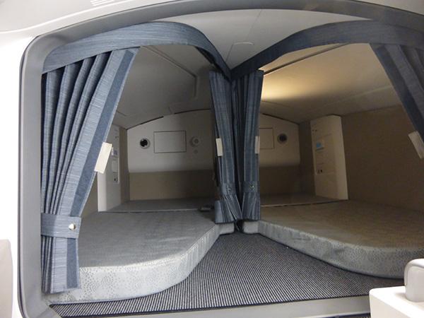 A crew rest area for pilots is located directly behind the cockpit.